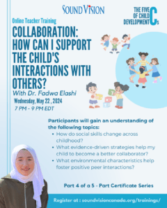 Join us online! Sound Vision Canada is very excited to be offering a five-part teacher training series focused on whole child development. We’re delighted to welcome back expert Dr. Fadwa Elashi to share her knowledge and insights in the following areas: