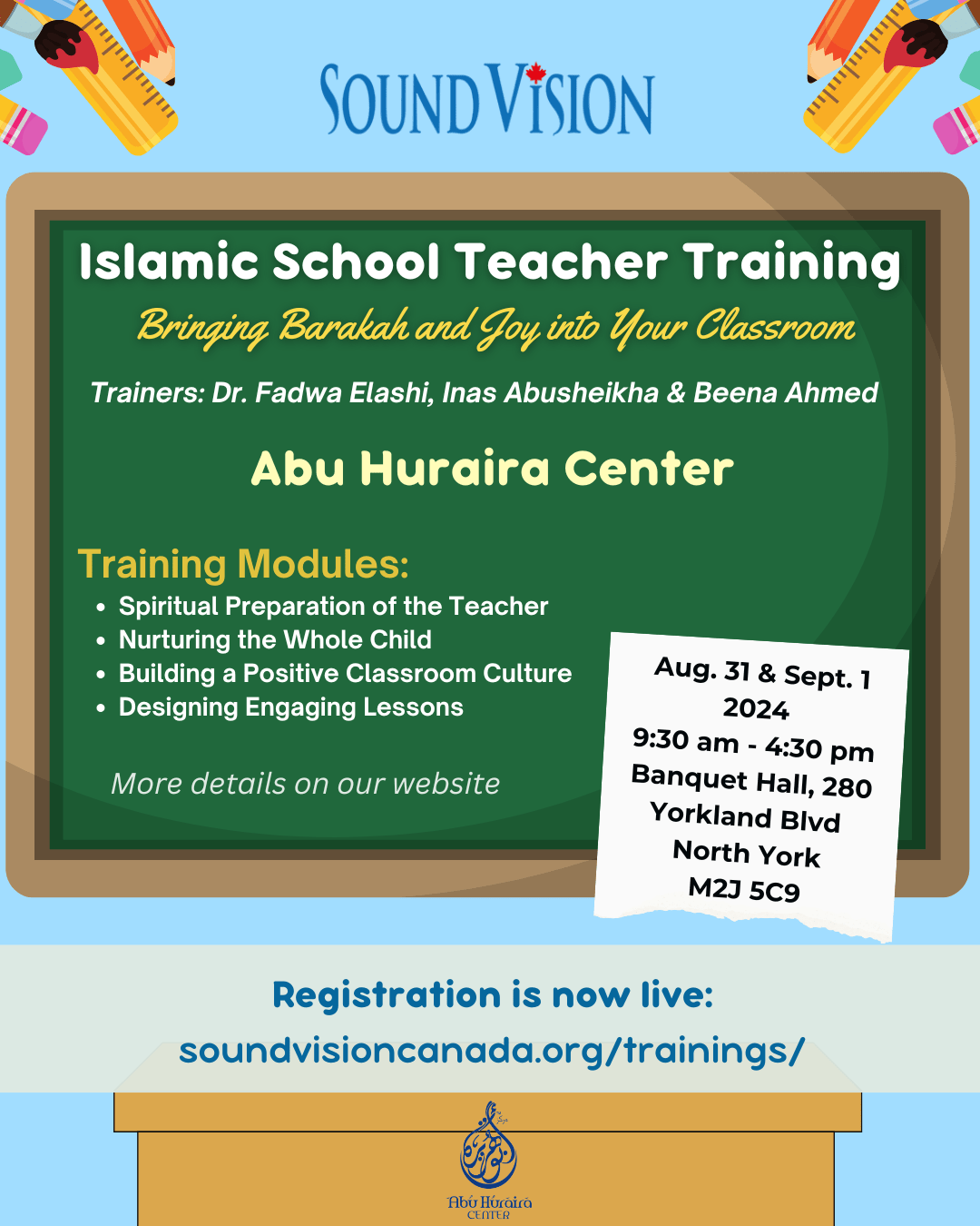 Bringing Barakah and Joy into Your Classroom Aug. 31 & Sept. 1, 2024 9:30 am - 4:30 pm each day Abu Huraira Center, Banquet Hall, 280 Yorkland Blvd, North York,…